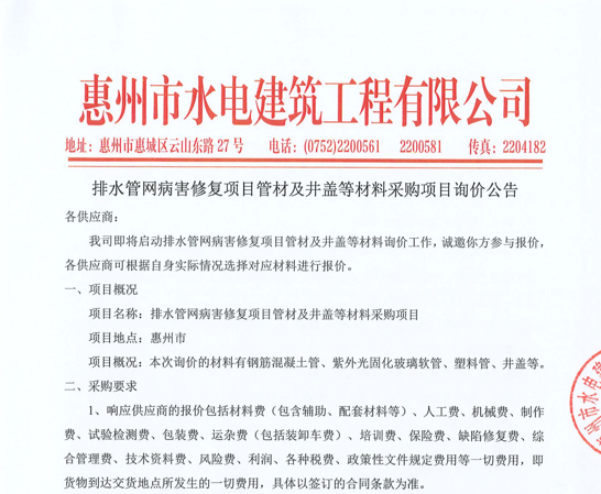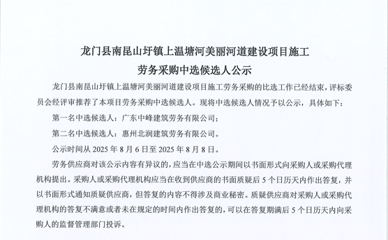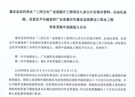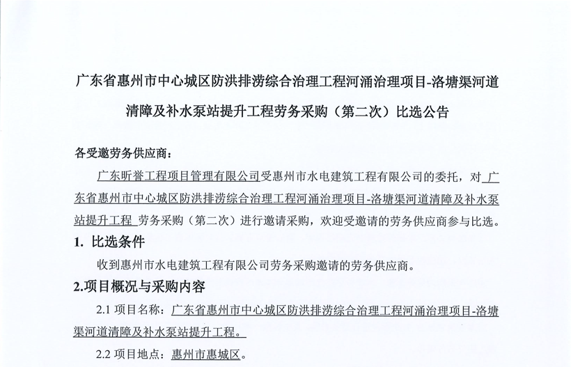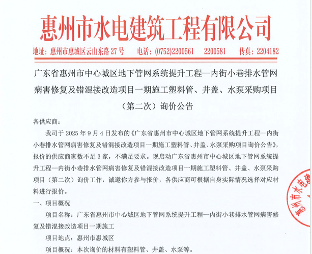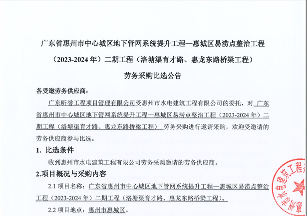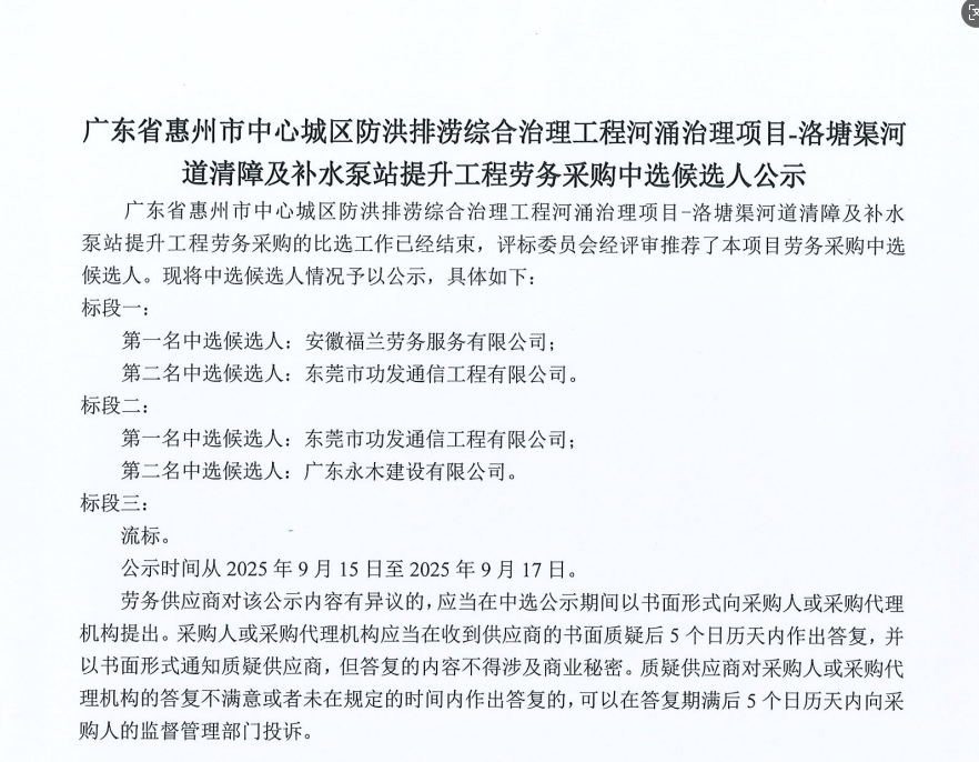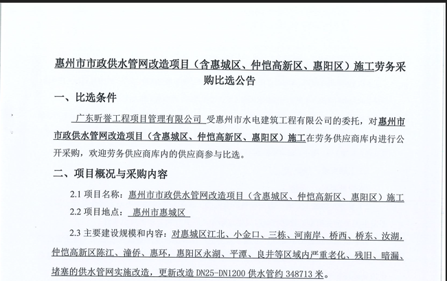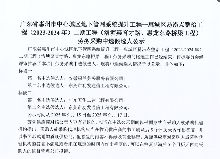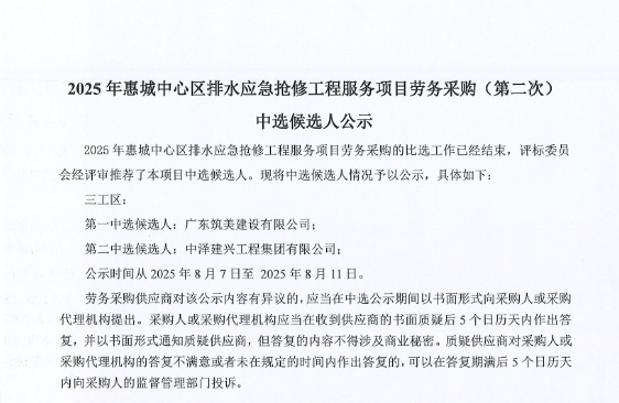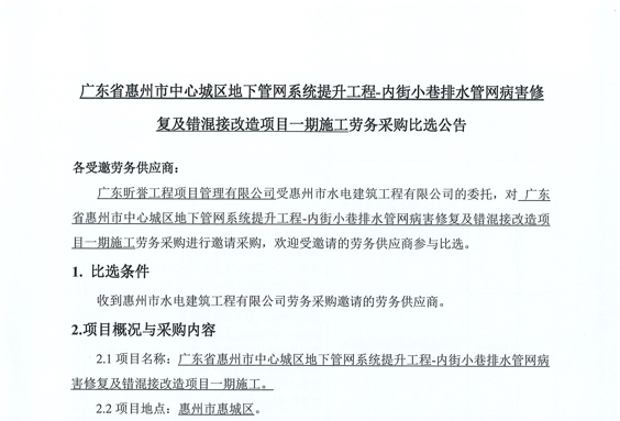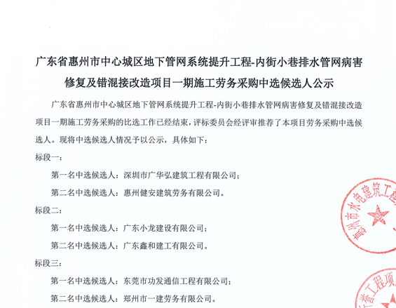廣東省惠州市中心城區(qū)地下管網(wǎng)系統(tǒng)提升工程-內(nèi)街小巷排水管網(wǎng)病害修復(fù)及錯混接改造項目一期施工勞務(wù)采購(第二次)中選候選人公示……